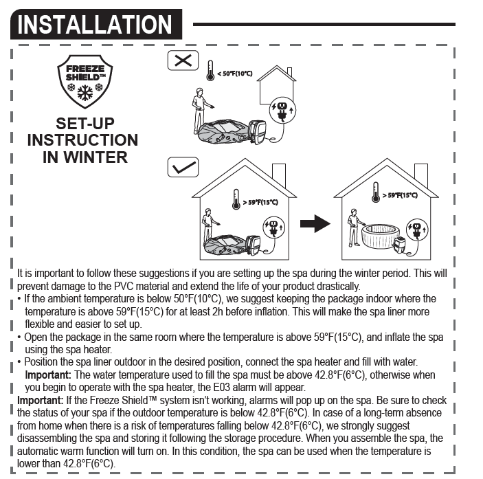 NE PAS faire fonctionner le spa ou le laisser dehors dans des températures inférieures à -10°C (14°F)